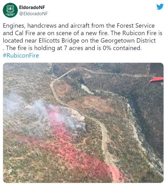 The area of the Rubicon Fire is about 14 miles northeast of Pollock Pines, California and is being held at approximately seven acres.