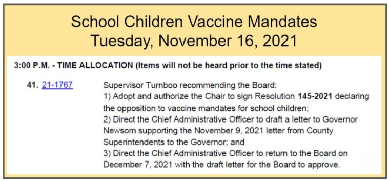 Adopt and authorize the Chair to sign Resolution 145-2021 declaring the opposition to vaccine mandates for school children;