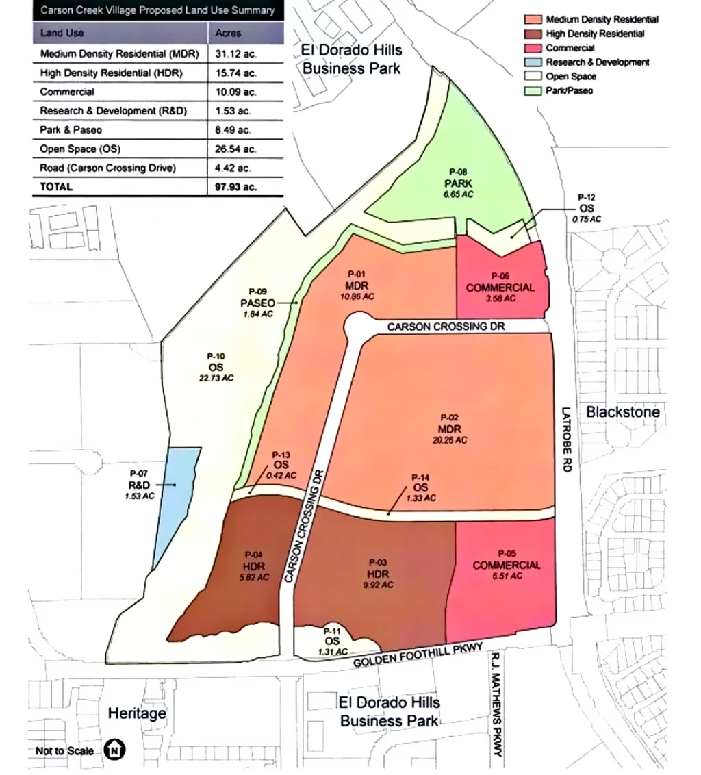 Carson Creek Village – Proposed Specific Plan for a new community integrating high and medium density housing, commercial services, parks, and open space on 97.93 acres located within the central portion of the El Dorado Hills Business Park.